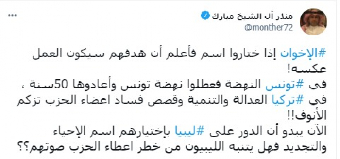 رأى المدون السعودي منذر آل الشيخ، أن تنظيم الإخوان الإرهابي نشر الفساد في تركيا، وعطل النهضة في تونس، محذرا من مصير مشابه في ليبيا.