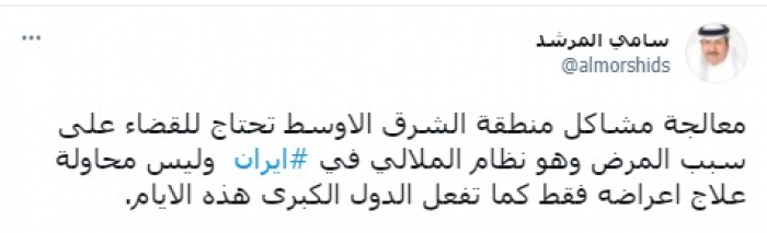ونبه في تغريدة على حسابه بموقع التدوين المصغر تويتر، اليوم إلى أن: "معالجة مشاكل منطقة الشرق الأوسط تحتاج للقضاء على سبب المرض وهو نظام الملالي في إيران، وليس محاولة علاج أعراضه فقط كما تفعل الدول الكبرى هذه الأيام".