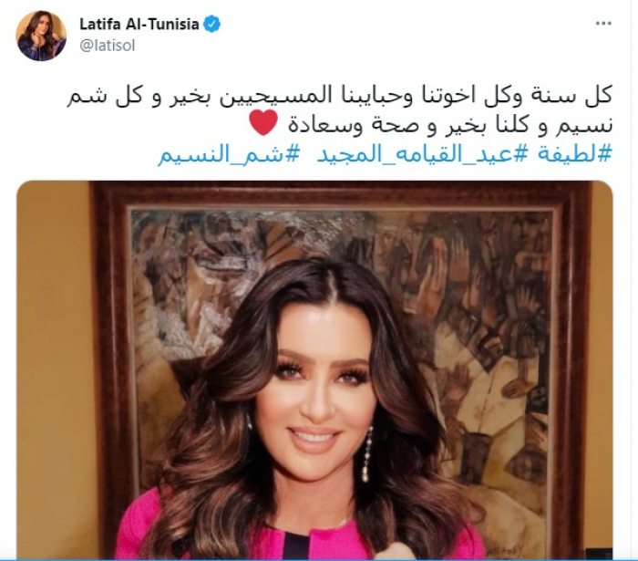 وكتبت لطيفة، عبر حسابها على موقع "تويتر": "كل سنة وكل أخواتنا وحبايبنا المسيحيين بخير، وكل شم نسيم وكلنا بخير وصحة وسعادة.. عيد القيامة المجيد، شم النسيم".
