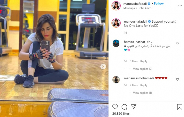 نشرت الفنانة منة فضالي صورتين، عبر حسابها الرسمي بموقع "إنستجرام". وظهرت منة في الصور من داخل "الجيم"، أثناء ممارسة التمارين الرياضية. وعلقت منة على الصور "أدعم نفسي".