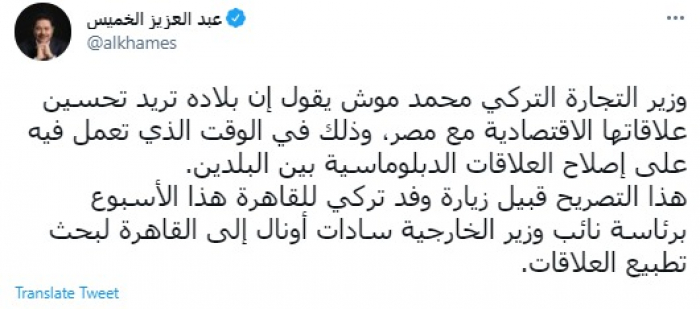 وقال في تغريدة عبر "تويتر" رصدها "المشهد العربي": "وزير التجارة التركي محمد موش يقول إن بلاده تريد تحسين علاقاتها الاقتصادية مع مصر، وذلك في الوقت الذي تعمل فيه على إصلاح العلاقات الدبلوماسية بين البلدين".