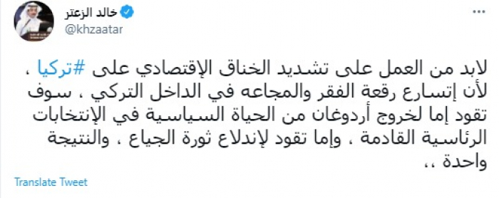 وقال في تغريدة عبر "تويتر" رصدها "المشهد العربي": "لا بد من العمل على تشديد الخناق الإقتصادي على تركيا ، لأن إتسارع رقعة الفقر والمجاعه في الداخل التركي ، سوف تقود إما لخروج أردوغان من الحياة السياسية في الإنتخابات الرئاسية القادمة ، وإما تقود لإندلاع ثورة الجياع ، والنتيجة واحدة".