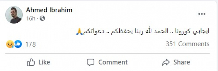 وكتب أحمد، عبر حسابه الشخصي بموقع "فيسبوك": "إيجابي كورونا.. الحمد لله ربنا يحفظكم، دعواتكم".