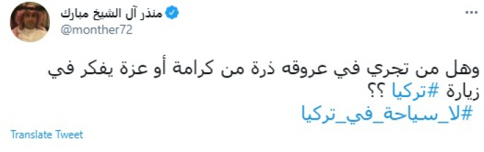 تفاعل المدون السعودي البارز منذر آل الشيخ مبارك، اليوم، مع هاشتاج "لا سياحة في تركيا".