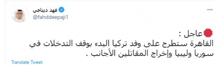 وكتب في تغريدة عبر "تويتر" رصدها "المشهد العربي": "القاهرة ستطرح على وفد تركيا البدء بوقف التدخلات في سوريا وليبيا وإخراج المقاتلين الأجانب".
