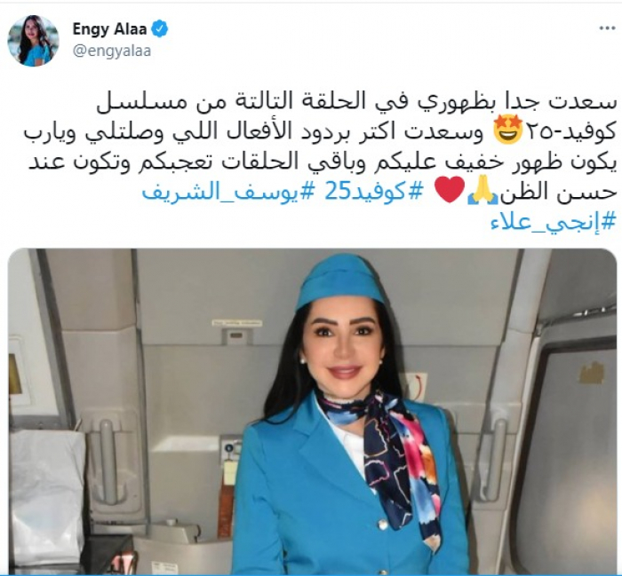 ونشرت إنجي صورة لها عبر حسابها الرسمي بموقع "تويتر"، وعلّقت: "سعدت جدا بظهوري في الحلقة الثالثة من مسلسل كوفيد 25، وسعدت أكتر بردود الأفعال اللي وصلتلي ويارب يكون ظهور خفيف عليكم وباقي الحلقات تعجبكم وتكون عند حسن الظن".