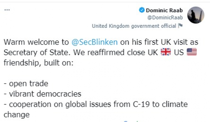 وقال في تغريدة على حسابه بموقع التدوين المصغر تويتر، اليوم إني: "أرحب بأنتوني بلينكن في أول زيارة له إلى المملكة المتحدة كوزير للخارجية".