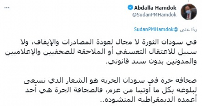 وأوضح في تغريدة على حسابه بموقع التدوين المصغر تويتر، اليوم أنه: "في سودان الثورة لا مجال لعودة المصادرات والإيقاف، ولا سبيل للاعتقال التعسفي أو الملاحقة للصحفيين والإعلاميين والمدونين بدون سند قانوني".