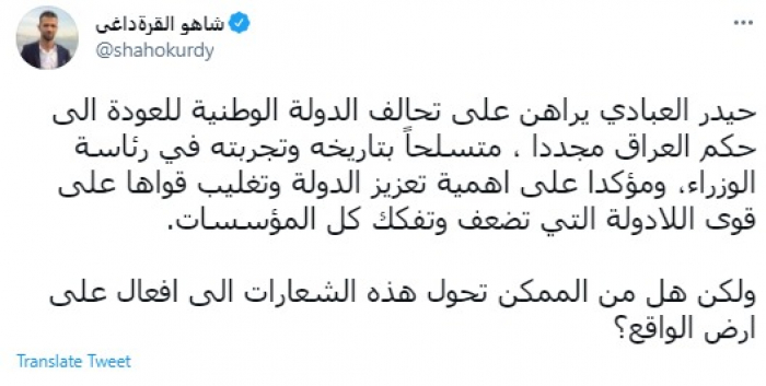 وقال في تغريدة عبر "تويتر" رصدها "المشهد العربي": "حيدر العبادي يراهن على تحالف الدولة الوطنية للعودة إلى حكم العراق مجددا ، متسلحاً بتاريخه وتجربته في رئاسة الوزراء، ومؤكدا على أهمية تعزيز الدولة وتغليب قواها على قوى اللادولة التي تضعف وتفكك كل المؤسسات".