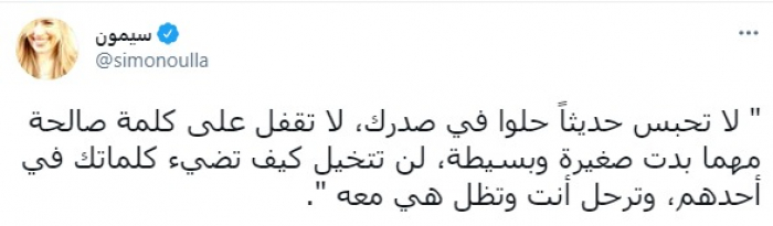 وكتبت سيمون قائلة: "لا تحبس حديثاً حلوا في صدرك، لا تقفل على كلمة صالحة مهما بدت صغيرة وبسيطة، لن تتخيل كيف تضيء كلماتك في أحدهم، وترحل أنت وتظل هي معه".