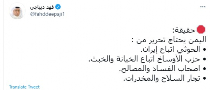 وكتب في تغريدة عبر "تويتر" رصدها "المشهد العربي": "حقيقة: اليمن يحتاج تحرير من:
