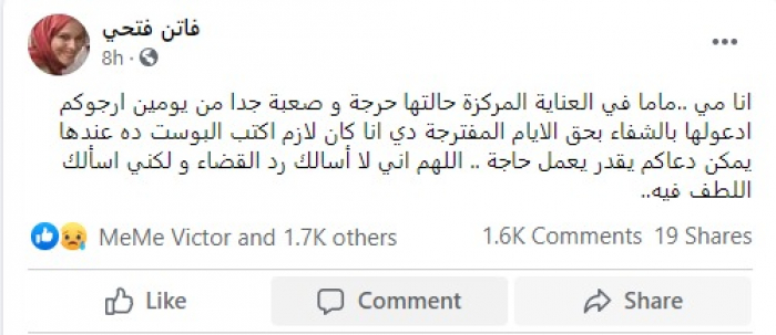 وطلبت ابنتها "مي"، الدعاء له من خلال حساب والدتها على "فيس بوك"، قائلة: "أنا مي ..ماما في العناية المركزة حالتها حرجة وصعبة جدا من يومين".