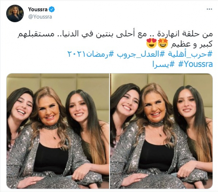 ونشرت "يسرا"، عبر حسابها بموقع "تويتر"، صورًا لها معهما وعلقت: "مع أحلى بنتين في الدنيا، مستقبلهم كبير وعظيم".