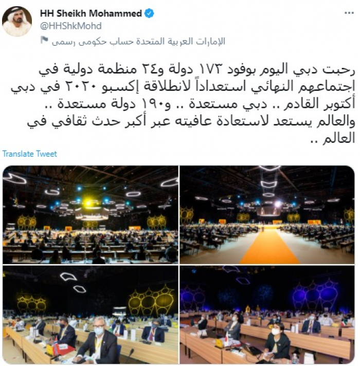 وقال في تغريدة عبر "تويتر" رصدها "المشهد العربي": "رحبت دبي اليوم بوفود ١٧٣ دولة و٢٤ منظمة دولية في اجتماعهم النهائي استعداداً لانطلاقة إكسبو ٢٠٢٠ في دبي أكتوبر القادم .. دبي مستعدة .. و١٩٠ دولة مستعدة .. والعالم يستعد لاستعادة عافيته عبر أكبر حدث ثقافي في العالم".