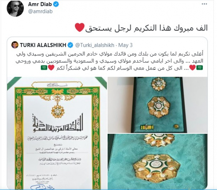 وغرد "عمرو"، عبر "تويتر" مهنئًا "آل الشيخ" قائلًا: " ألف مبروك هذا التكريم لرجل يستحق".