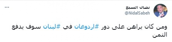 وأشار في تغريدة على حسابه بموقع التدوين المصغر تويتر، اليوم إلى أن: "من كان يراهن على دور أردوغان في لبنان سوف يدفع الثمن".