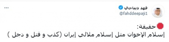 وقال في تغريدة على حسابه بموقع التدوين المصغر تويتر، اليوم إن: "إسلام الإخوان مثل إسلام ملالي إيران (كذب و قتل و دجل)".