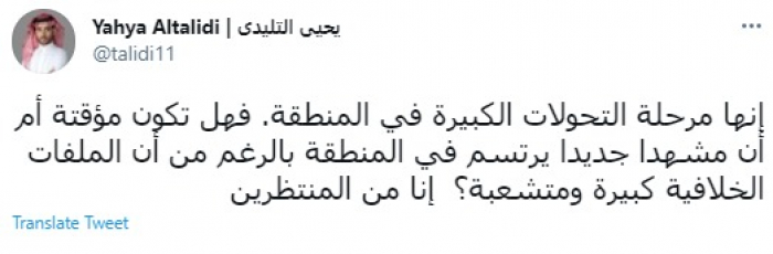 علق المحلل السياسي السعودي يحيى التليدي، اليوم، على التطورات الكبيرة التي تشهدها المنطقة العربية.