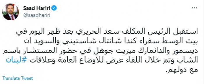 وقال في تغريدة عبر "تويتر" رصدها "المشهد العربي": "استقبل الرئيس المكلف سعد الحريري بعد ظهر اليوم في بيت الوسط سفراء كندا شانتال شاستيني والسويد ان ديسمور والدانمارك ميريت جوهل في حضور المستشار باسم الشاب وتم خلال اللقاء عرض للأوضاع العامة وعلاقات لبنان مع دولهم".