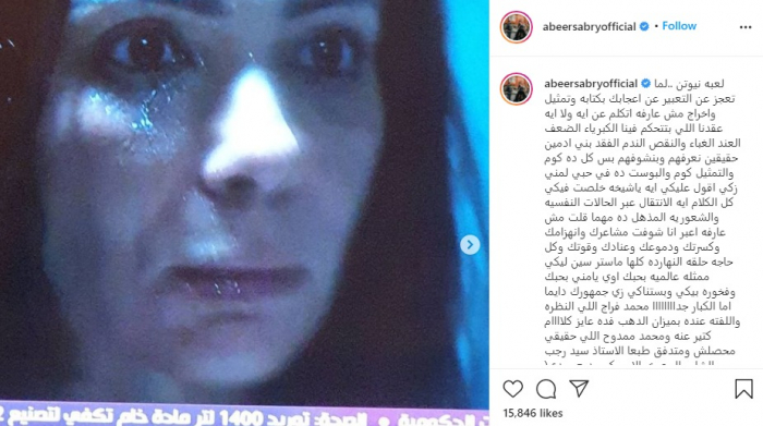 وكتبت "عبير" عبر "إنستجرام": "لعبة نيوتن، لما تعجز عن التعبير عن إعجابك بكتابة وتمثيل وإخراج مش عارفة اتكلم عن إيه ولا إيه، عقدنا اللي بتتحكم فينا، الكبرياء، الضعف، العند، الغباء والنقص بس كل ده كوم والتمثيل كوم".
