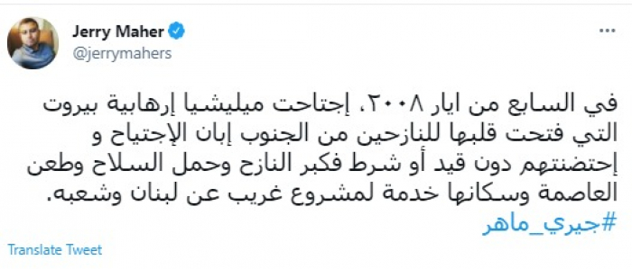 وقال في تغريدة عبر "تويتر" رصدها "المشهد العربي": "في السابع من ايار ٢٠٠٨، إجتاحت ميليشيا إرهابية بيروت التي فتحت قلبها للنازحين من الجنوب إبان الإجتياح و إحتضنتهم دون قيد أو شرط فكبر النازح وحمل السلاح وطعن العاصمة وسكانها خدمة لمشروع غريب عن لبنان وشعبه".