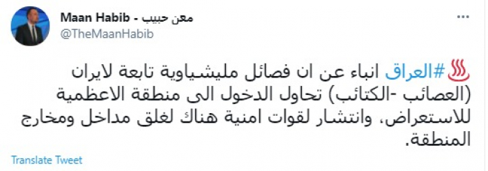 وقال في تغريدة عبر "تويتر" رصدها "المشهد العربي": "العراق.. أنباء عن أن فصائل مليشياوية تابعة لايران (العصائب -الكتائب) تحاول الدخول إلى منطقة الاعظمية للاستعراض، وانتشار لقوات أمنية هناك لغلق مداخل ومخارج المنطقة".
