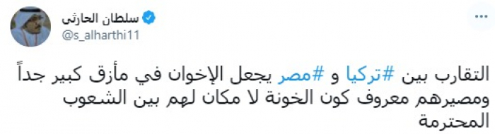وكتب في تغريدة عبر "تويتر" رصدها "المشهد العربي": "التقارب بين تركيا ومصر يجعل الإخوان في مأزق كبير جداً ومصيرهم معروف كون الخونة لا مكان لهم بين الشعوب المحترمة".