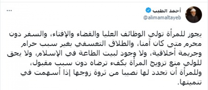 أفتى الإمام الأكبر الدكتور أحمد الطيب، شيخ الأزهر الشريف، بجواز تولي المرأة للمناصب العليا ومنها الإفتاء، والقضاء.