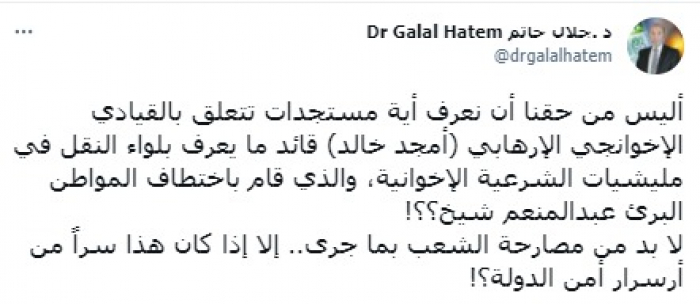 حاتم يطالب بالكشف عن مصير الإرهابي أمجد خالد