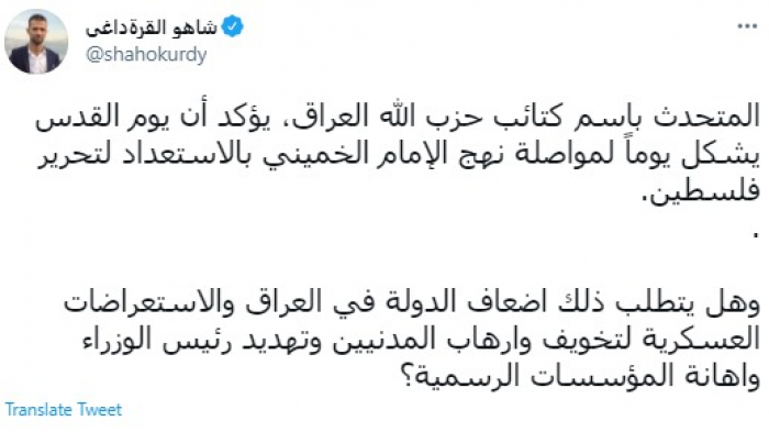علق الكاتب الصحفي العراقي شاهو القرةداغي، اليوم، على التصريحات الأخيرة للمتحدث باسم كتائب حزب الله العراقي بشأن يوم القدس.