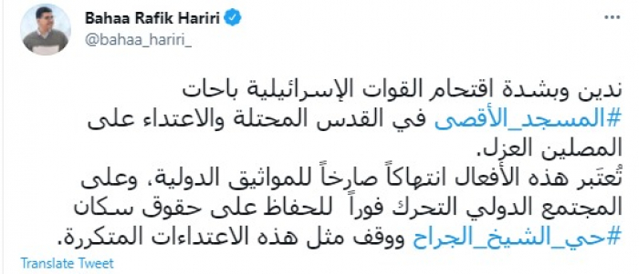 أدان السياسي اللبناني البارز بهاء الحريري، اليوم، اقتحام القوات الإسرائيلية باحات المسجد الأقصى في القدس والاعتداء على المصلين العزل.