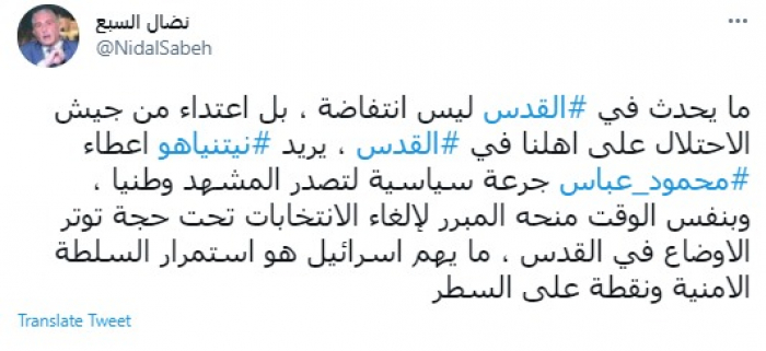 وكتب في تغريدة عبر "تويتر" رصدها "المشهد العربي": "ما يحدث في القدس ليس انتفاضة، بل اعتداء من جيش الاحتلال على أهلنا في القدس ، يريد نيتنياهو إعطاء محمود عباس جرعة سياسية لتصدر المشهد وطنيا".