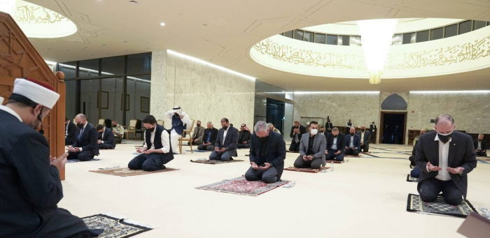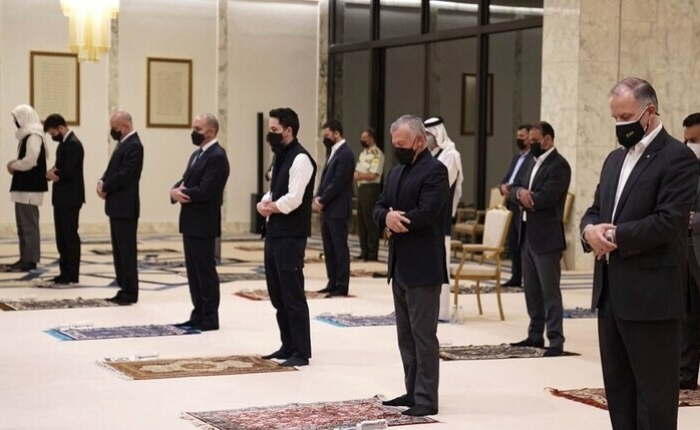 ونشر الديوان الملكي الأردني صورا تظهر الملك عبدالله وولي عهده يؤدون الصلاة في مسجد الهاشمية.