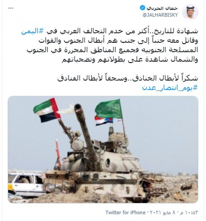 وكتب "الحربي" تغريدة عبر تويتر، رصدها "المشهد العربي": "شهادة للتاريخ..أكثر من خدم التحالف العربي في اليمن وقاتل معه جنبا إلى جنب هم أبطال الجنوب والقوات المسلحة الجنوبية فجميع المناطق المحررة في الجنوب والشمال شاهدة على بطولاتهم وتضحياتهم".