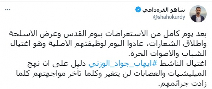 وكتب في تغريدة عبر "تويتر" رصدها "المشهد العربي": "بعد يوم كامل من الاستعراضات بيوم القدس وعرض الأسلحة وإطلاق الشعارات، عادوا اليوم لوظيفتهم الاصلية وهو اغتيال الشباب والاصوات الحرة".