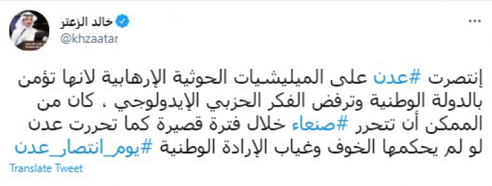 وكتب في تغريدة عبر "تويتر" رصدها "المشهد العربي": "انتصرت عدن على المليشيات الحوثية الإرهابية لانها تؤمن بالدولة الوطنية وترفض الفكر الحزبي الأيدولوجي".