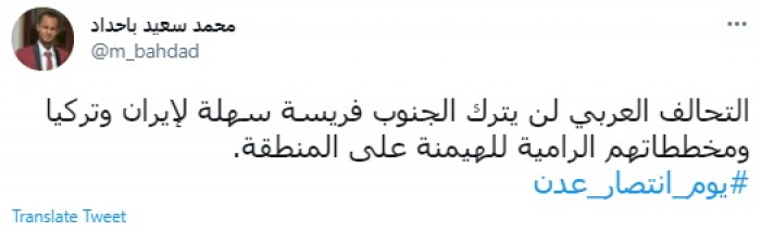 وكتب في تغريدة عبر "تويتر" رصدها "المشهد العربي": "التحالف العربي لن يترك الجنوب فريسة سهلة لإيران وتركيا ومخططاتهم الرامية للهيمنة على المنطقة".