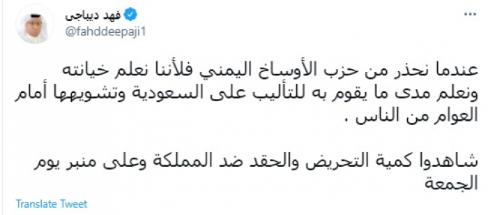 استنكر المحلل السياسي السعودي فهد ديباجي، اليوم، تحريض أحد الأئمة الموالين لجماعة الإخوان الإرهابية باليمن (حزب الإصلاح اليمني) على المملكة العربية السعودية من على منابر أحد المساجد في شبوة.