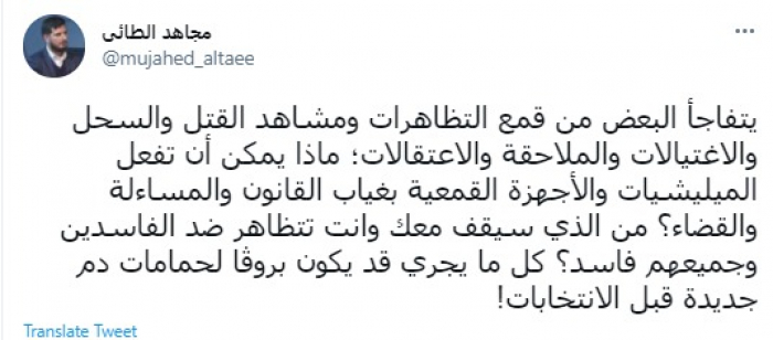 وقال في تغريدة عبر "تويتر" رصدها "المشهد العربي": "يتفاجأ البعض من قمع التظاهرات ومشاهد القتل والسحل والاغتيالات والملاحقة والاعتقالات؛ ماذا يمكن أن تفعل الميليشيات والأجهزة القمعية بغياب القانون والمساءلة والقضاء؟ من الذي سيقف معك وانت تتظاهر ضد الفاسدين وجميعهم فاسد؟ كل ما يجري قد يكون بروڤا لحمامات دم جديدة قبل الانتخابات".