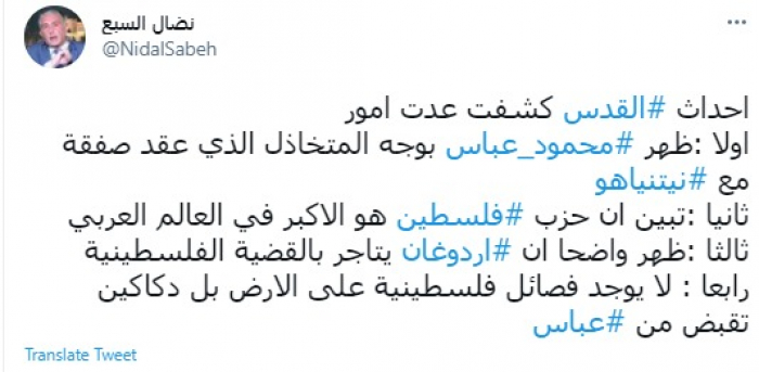 وكتب في تغريدة عبر "تويتر" رصدها "المشهد العربي": "أحداث القدس كشفت عدة أمور أولا : ظهر محمود عباس بوجه المتخاذل الذي عقد صفقة مع نيتنياهو ".