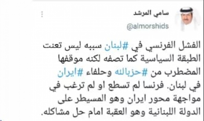 وقال في تغريدة عبر "تويتر" رصدها "المشهد العربي": "الفشل الفرنسي في لبنان سببه ليس تعنت الطبقة السياسية كما تصفه لكنه موقفها المضطرب من حزبالله وحلفاء إيران في لبنان".