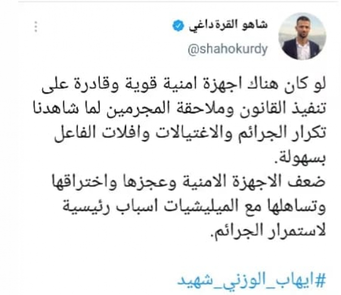 وقال في تغريدة عبر "تويتر" رصدها "المشهد العربي": "لو كان هناك اجهزة امنية قوية وقادرة على تنفيذ القانون وملاحقة المجرمين لما شاهدنا تكرار الجرائم والاغتيالات وافلات الفاعل بسهولة".