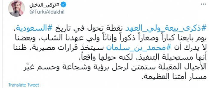 وكتب في تغريدة عبر "تويتر" رصدها "المشهد العربي": "ذكرى بيعة ولي العهد نقطة تحول في تاريخ السعودية، يوم بايعنا كباراً وصغاراً ذكوراً وإناثاً ولي عهدنا الشاب، وبعضنا لا يدرك أن محمد بن سلمان سيتخذ قرارات مصيرية، ظننا أنها مستحيلة التنفيذ، لكنه حولها واقعاً".
