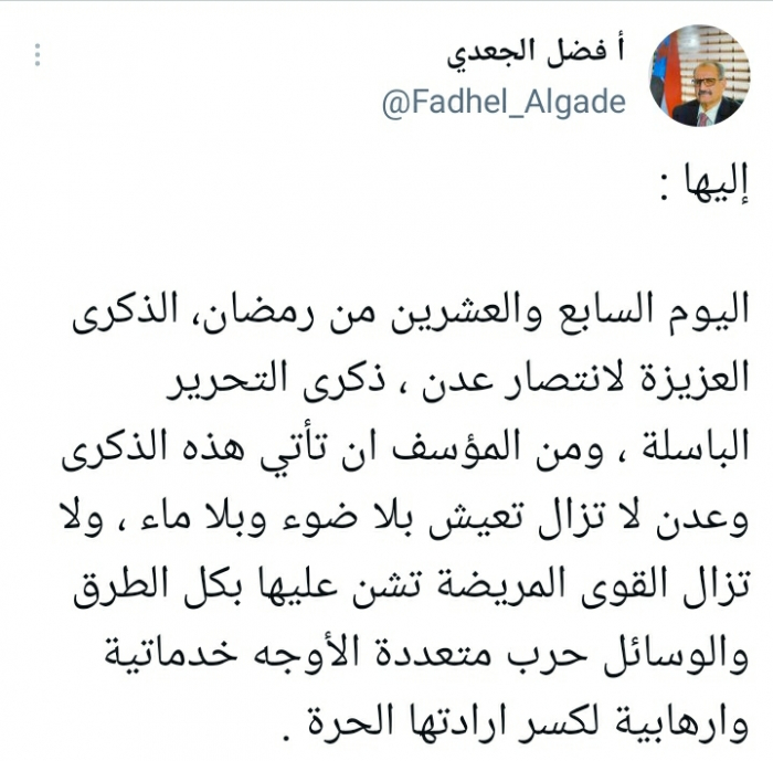 واعتبر أنه: "من المؤسف أن تأتي هذه الذكرى وعدن لا تزال تعيش بلا ضوء وبلا ماء، ولا تزال القوى المريضة تشن عليها بكل الطرق والوسائل حربا متعددة الأوجه خدماتية وإرهابية لكسر إرادتها الحرة".
