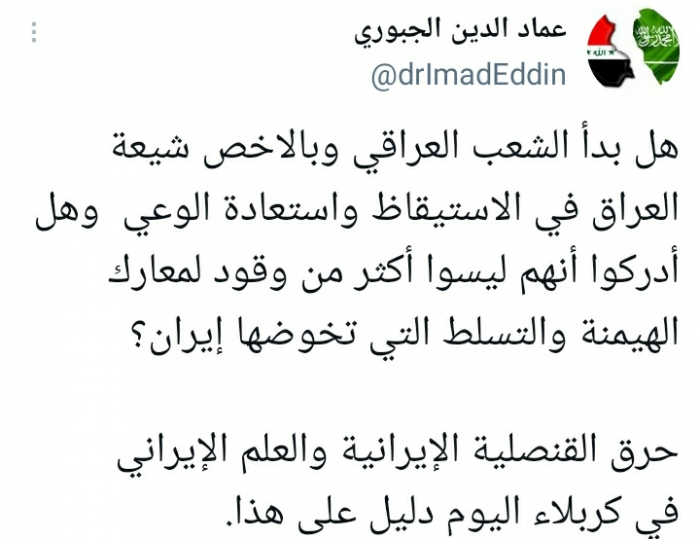 وشدد على أن: "حرق القنصلية الإيرانية والعلم الإيراني في كربلاء اليوم دليل على هذا".