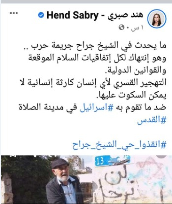 وصفت الفنانة التونسية هند صبري ما تقوم به سلطات الاحتلال الإسرائيلي تجاه سكان حي الشيخ جراح في القدس، بأنه جريمة حرب، وانتهاك لكل اتفاقيات السلام والقوانين الدولية.
