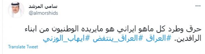 وكتب في تغريدة عبر "تويتر" رصدها "المشهد العربي": "حرق وطرد كل ما هو إيراني هو ما يريده الوطنيون من أبناء الرافدين".
