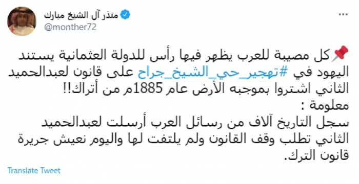 وكتب في تغريدة عبر "تويتر" رصدها "المشهد العربي": "كل مصيبة للعرب يظهر فيها رأس للدولة العثمانية يستند اليهود في تهجير حي الشيخ جراح على قانون لعبدالحميد الثاني اشتروا بموجبه الأرض عام 1885م من أتراك".