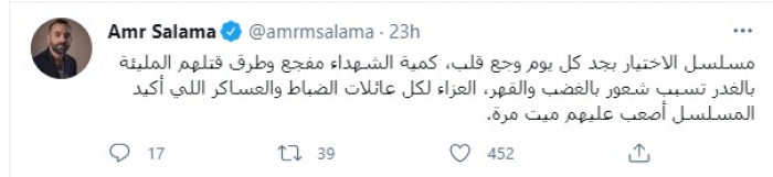وكتب سلامة، عبر حسابه على "تويتر": "مسلسل الاختيار.. بجد كل يوم وجع قلب، كمية الشهداء مفجع وطرق قتلهم المليئة بالغدر تسبب شعور بالغضب والقهر.. العزاء لكل عائلات الضباط والعساكر اللي أكيد المسلسل أصعب عليهم ميت مرة".