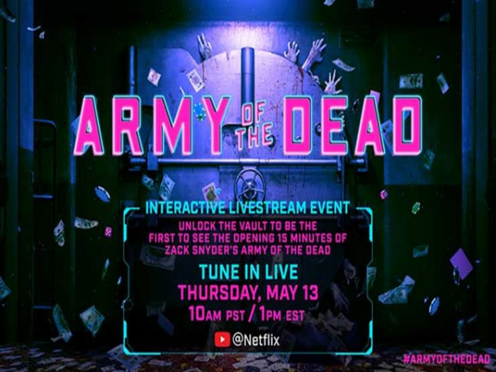 تستضيف نتفليكس يوم الخميس ١٣ مايو فعالية بث مباشر حصريًا على قناتها على يوتيوب. إذ يمكن للمتابعين الدخول على البث المباشر ليعيشوا تجربة تفاعلية ويصبحوا جزءًا من الكشف الحصري لأول ١٥ دقيقة من فيلم زاك سنايدر ونتفليكس المنتظر Army of The Dead.
